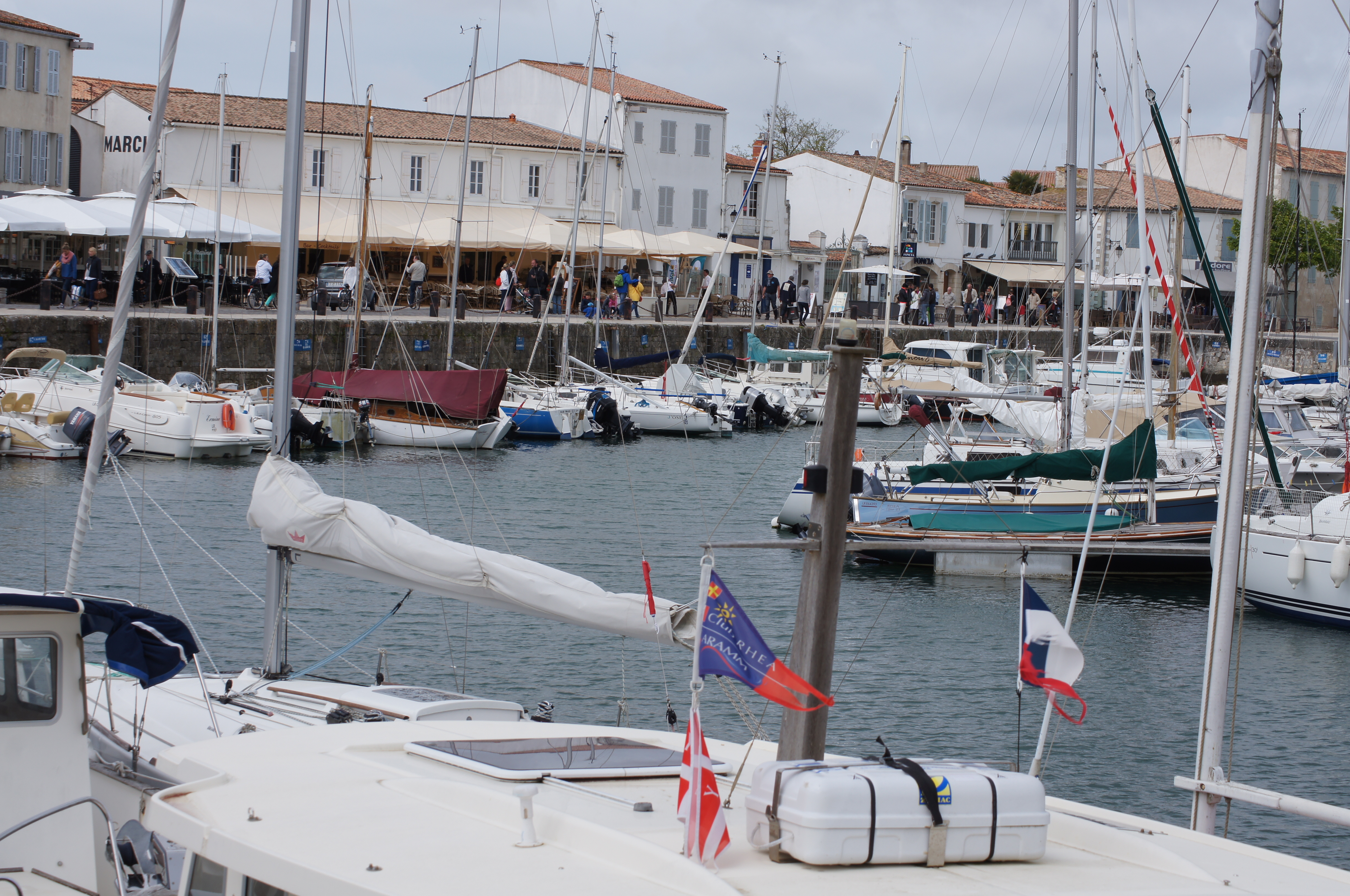 The campsite, L'Ocean, has everything you could want. HL is having a massage at the moment. The whole site is like a wee village with roads, pavements, named Alles - we are in the Alles de la Troquette, No. 203. - so we have an address! There is a take away pizza place, they also do yummy chips, a bar/restaurant, which we have yet to try, a well-stocked grocery store, you could really arrive and be catered for without having to move at all. But the island has a number of towns, which we have yet to see, we ended up in Ars-en (of) Ré yesterday, loved the name of this town (^_^). Found a L'Eclerc supermarché yesterday, now I really believe I am in France.